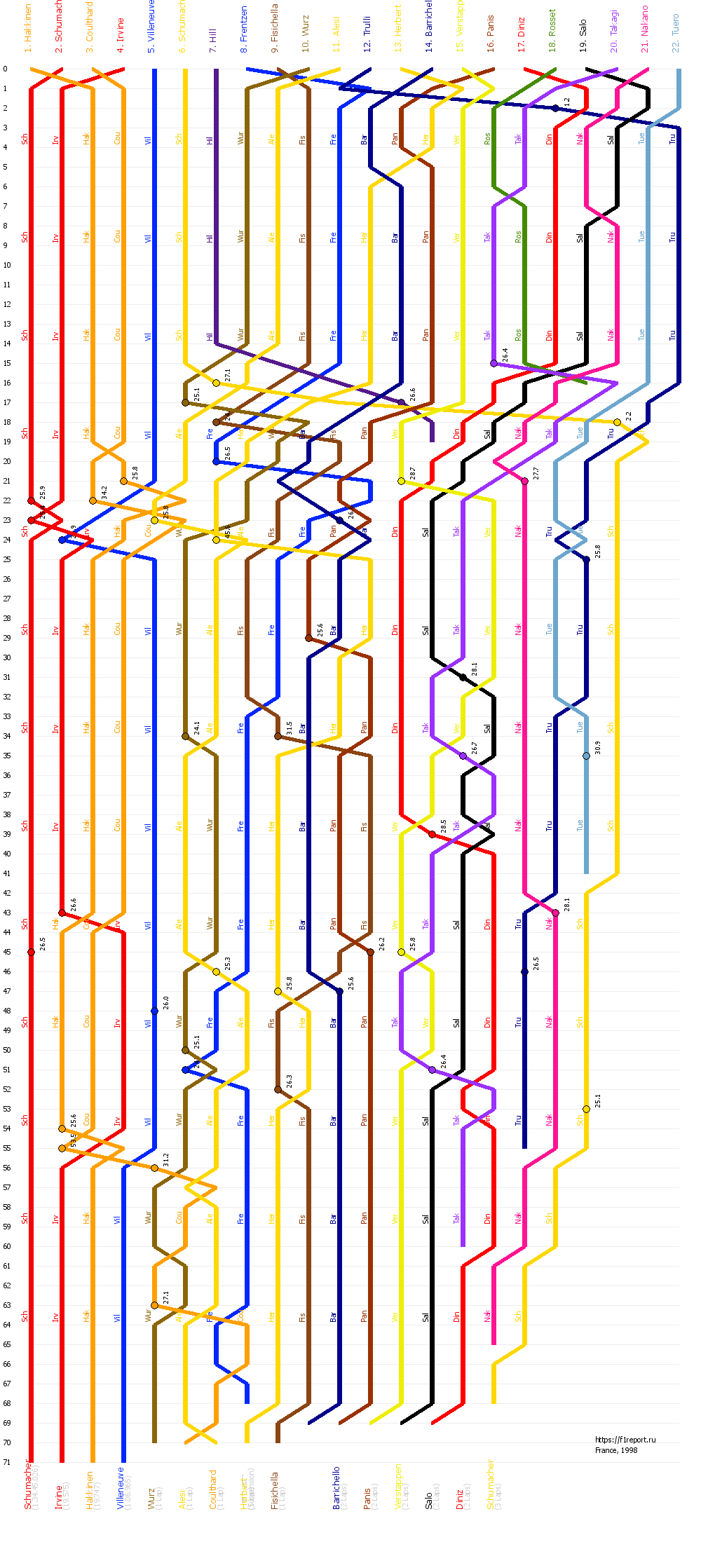 Диаграмма отображает смену позиций пилотов Формулы-1 на всем протяжении дистанции гран-при Франции 1998. Точками отмечены пит-стопы с указанием времени остановки.