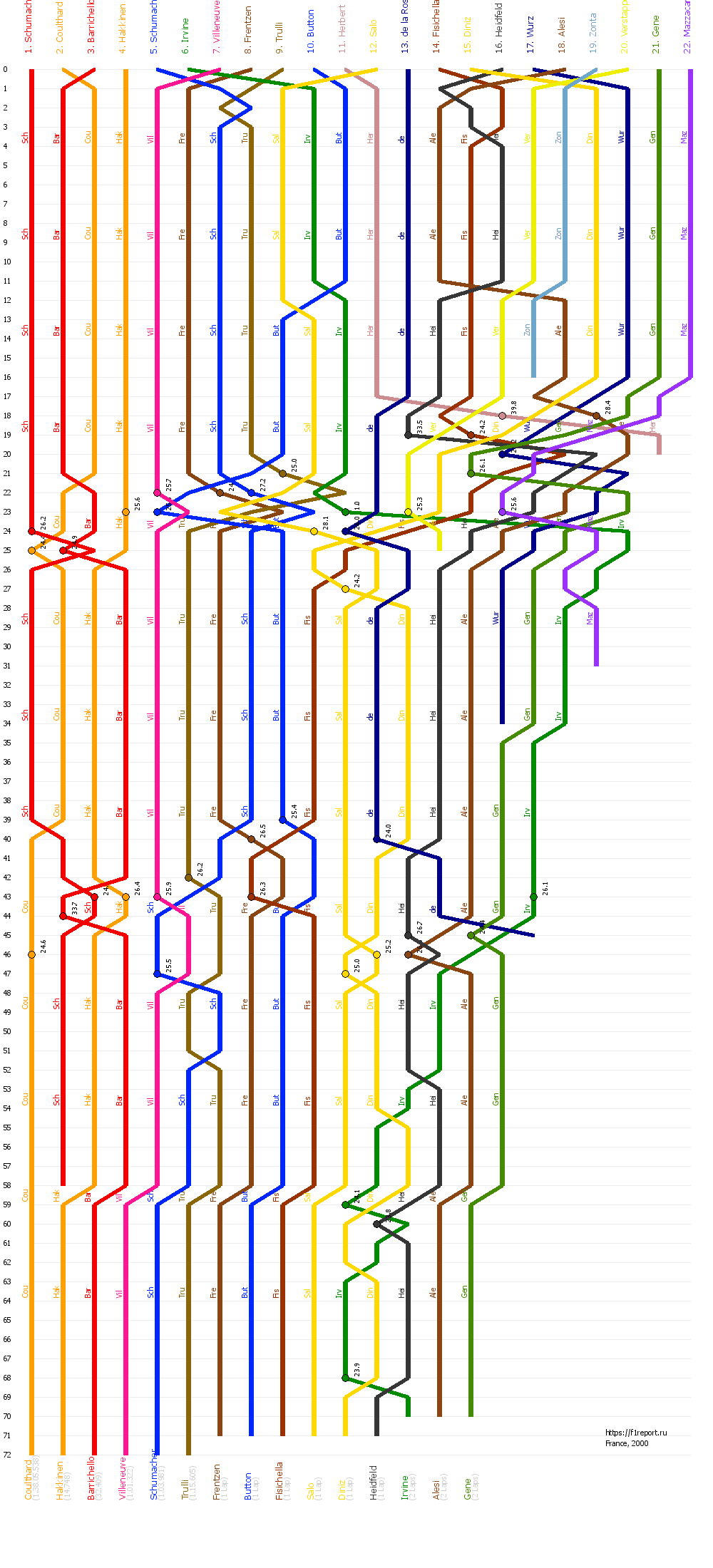Диаграмма отображает смену позиций пилотов Формулы-1 на всем протяжении дистанции гран-при Франции 2000. Точками отмечены пит-стопы с указанием времени остановки.