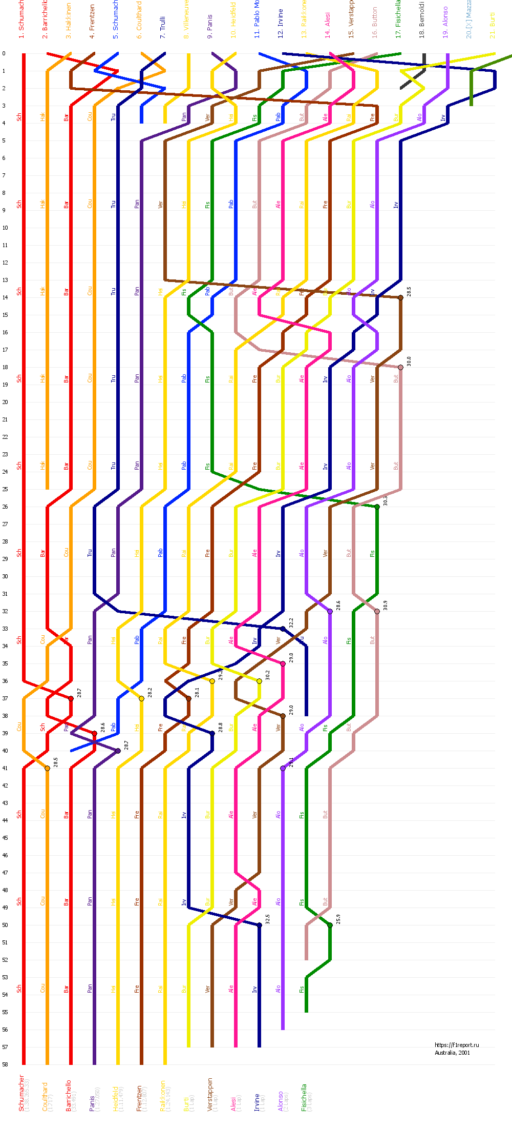 Диаграмма отображает смену позиций пилотов Формулы-1 на всем протяжении дистанции гран-при Австралии 2001. Точками отмечены пит-стопы с указанием времени остановки.