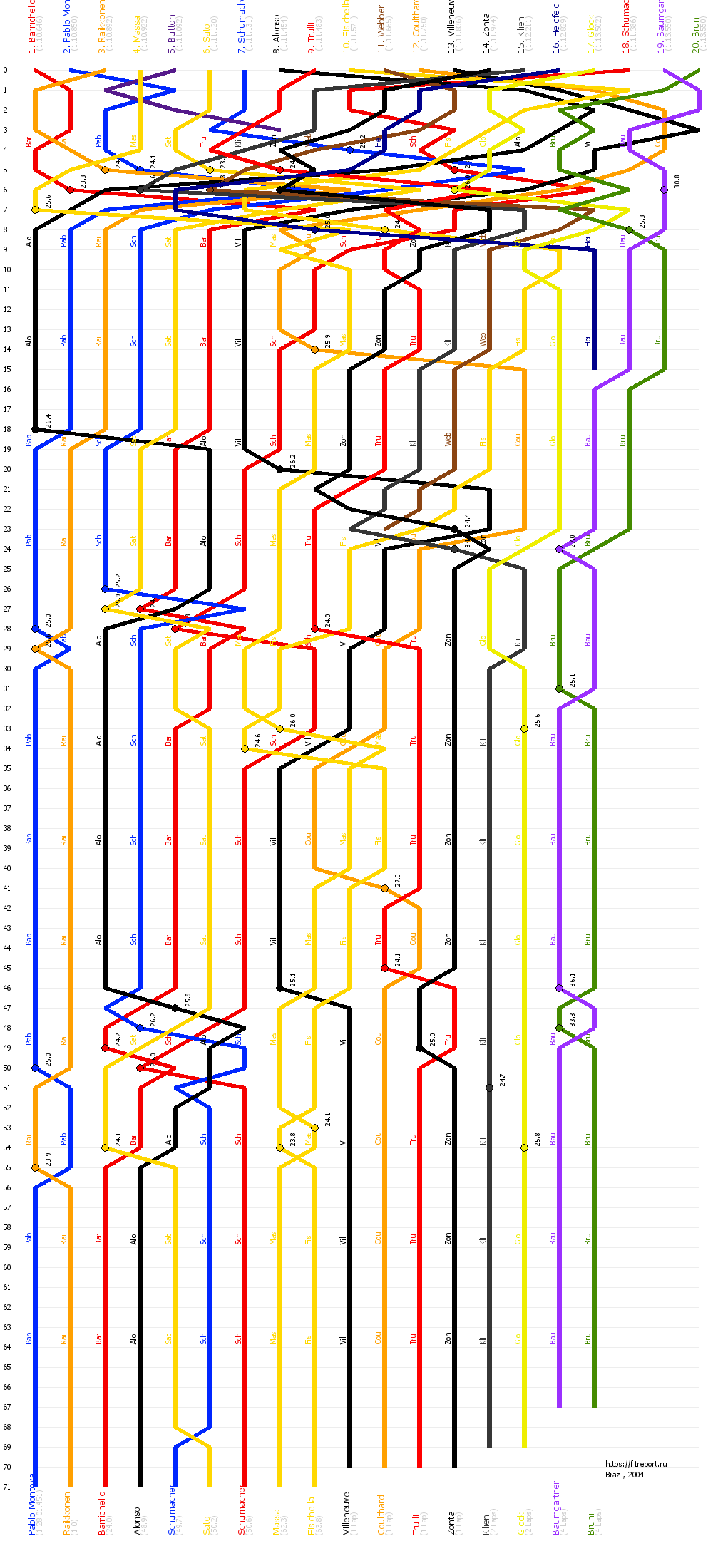 Диаграмма отображает смену позиций пилотов Формулы-1 на всем протяжении дистанции гран-при Бразилии 2004. Точками отмечены пит-стопы с указанием времени остановки.