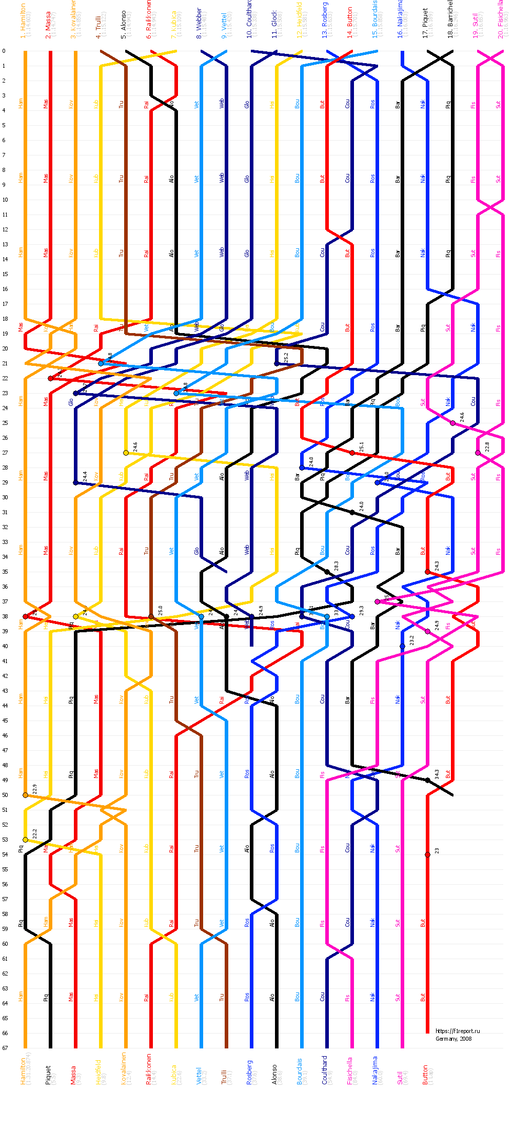 Диаграмма отображает смену позиций пилотов Формулы-1 на всем протяжении дистанции гран-при Германии 2008. Точками отмечены пит-стопы с указанием времени остановки.