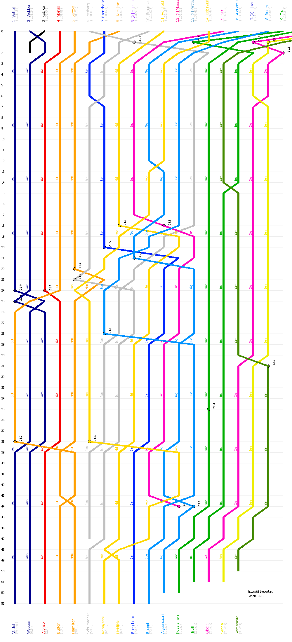 Диаграмма отображает смену позиций пилотов Формулы-1 на всем протяжении дистанции гран-при Японии 2010. Точками отмечены пит-стопы с указанием времени остановки.