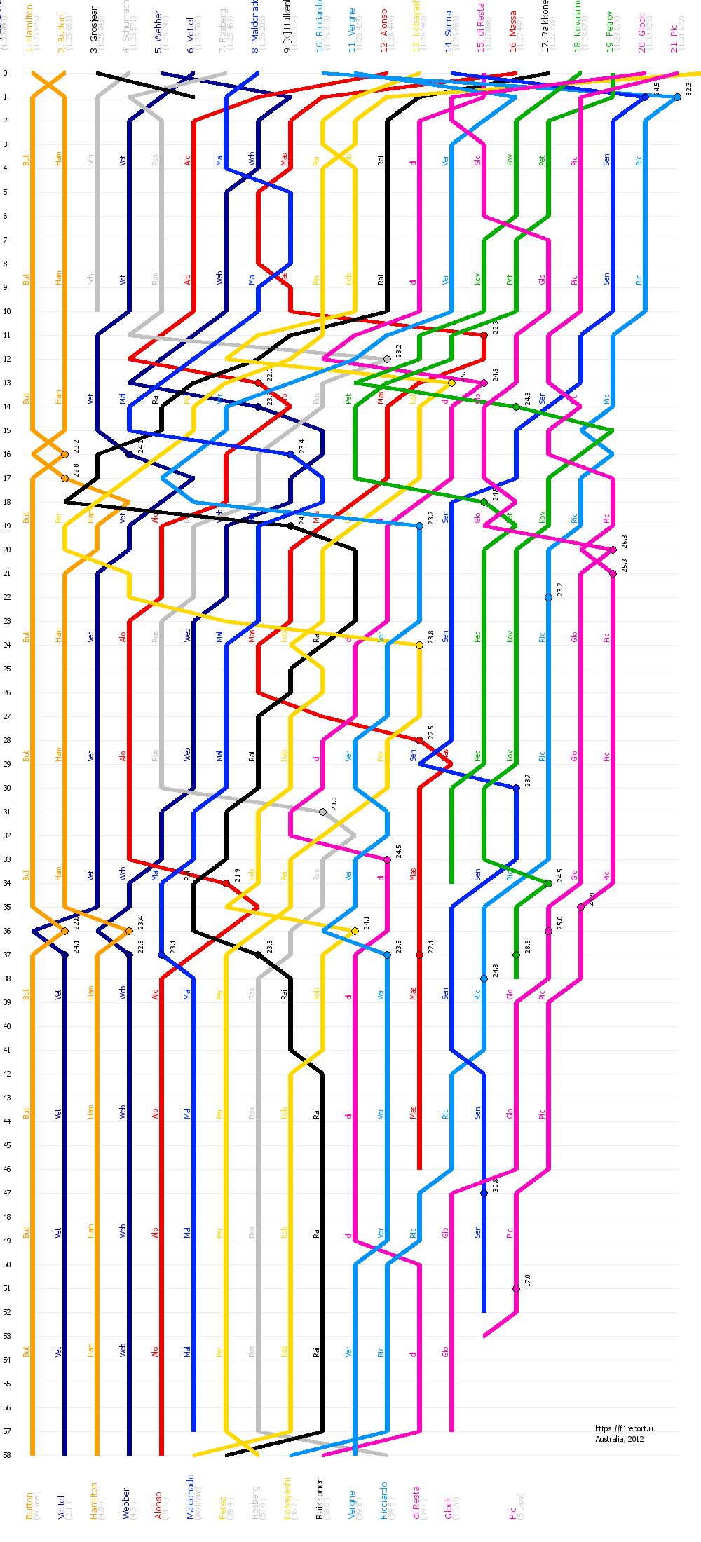 Диаграмма отображает смену позиций пилотов Формулы-1 на всем протяжении дистанции гран-при Австралии 2012. Точками отмечены пит-стопы с указанием времени остановки.