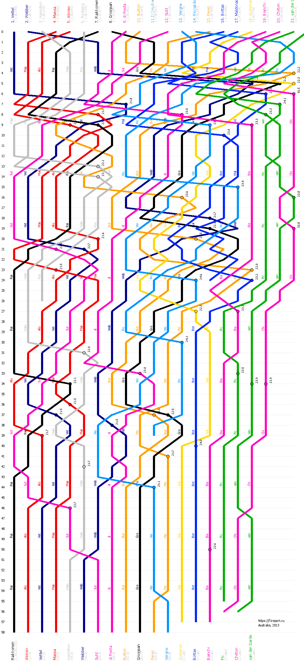 Диаграмма отображает смену позиций пилотов Формулы-1 на всем протяжении дистанции гран-при Австралии 2013. Точками отмечены пит-стопы с указанием времени остановки.