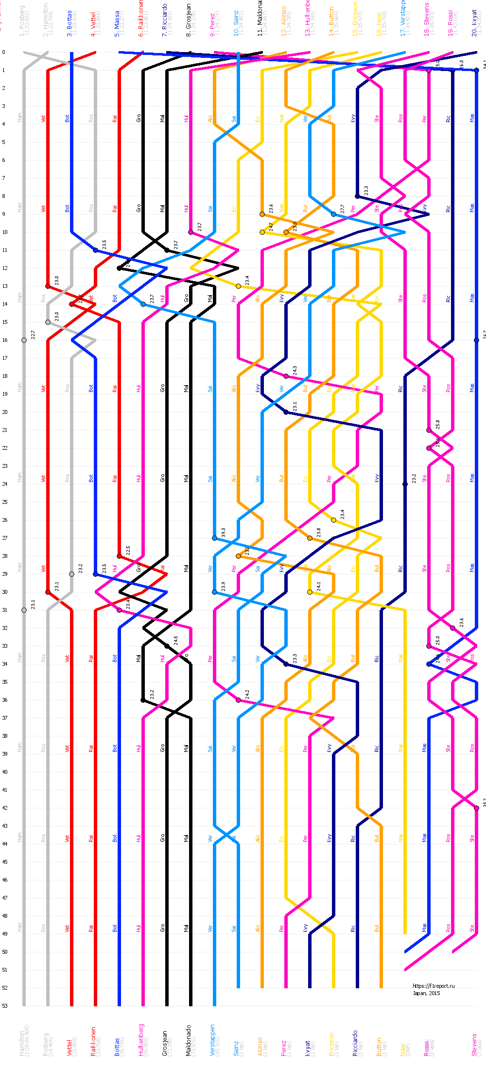 Диаграмма отображает смену позиций пилотов Формулы-1 на всем протяжении дистанции гран-при Японии 2015. Точками отмечены пит-стопы с указанием времени остановки.