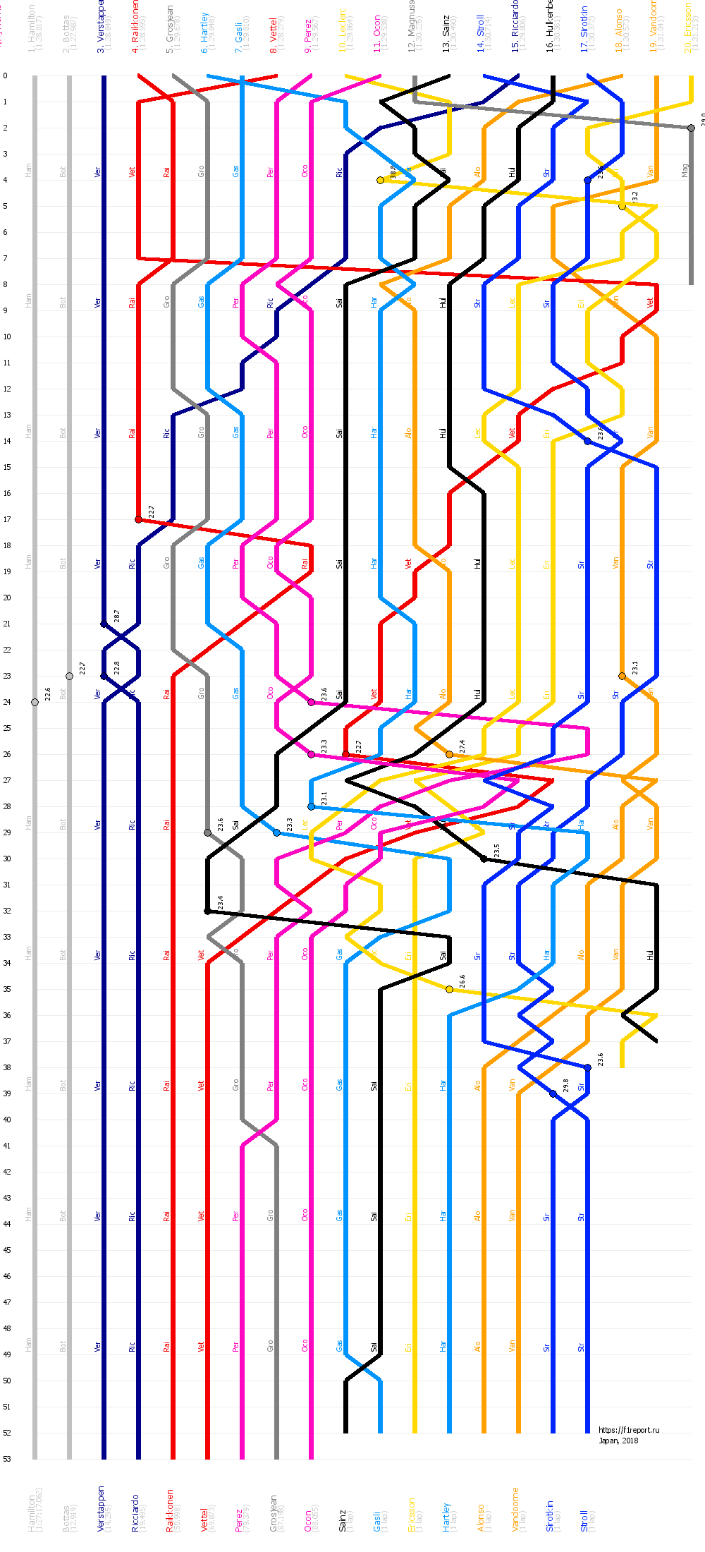 Диаграмма отображает смену позиций пилотов Формулы-1 на всем протяжении дистанции гран-при Японии 2018. Точками отмечены пит-стопы с указанием времени остановки.