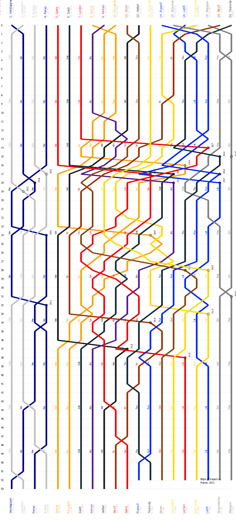 Диаграмма отображает смену позиций пилотов Формулы-1 на всем протяжении дистанции гран-при Франции 2021. Точками отмечены пит-стопы с указанием времени остановки.