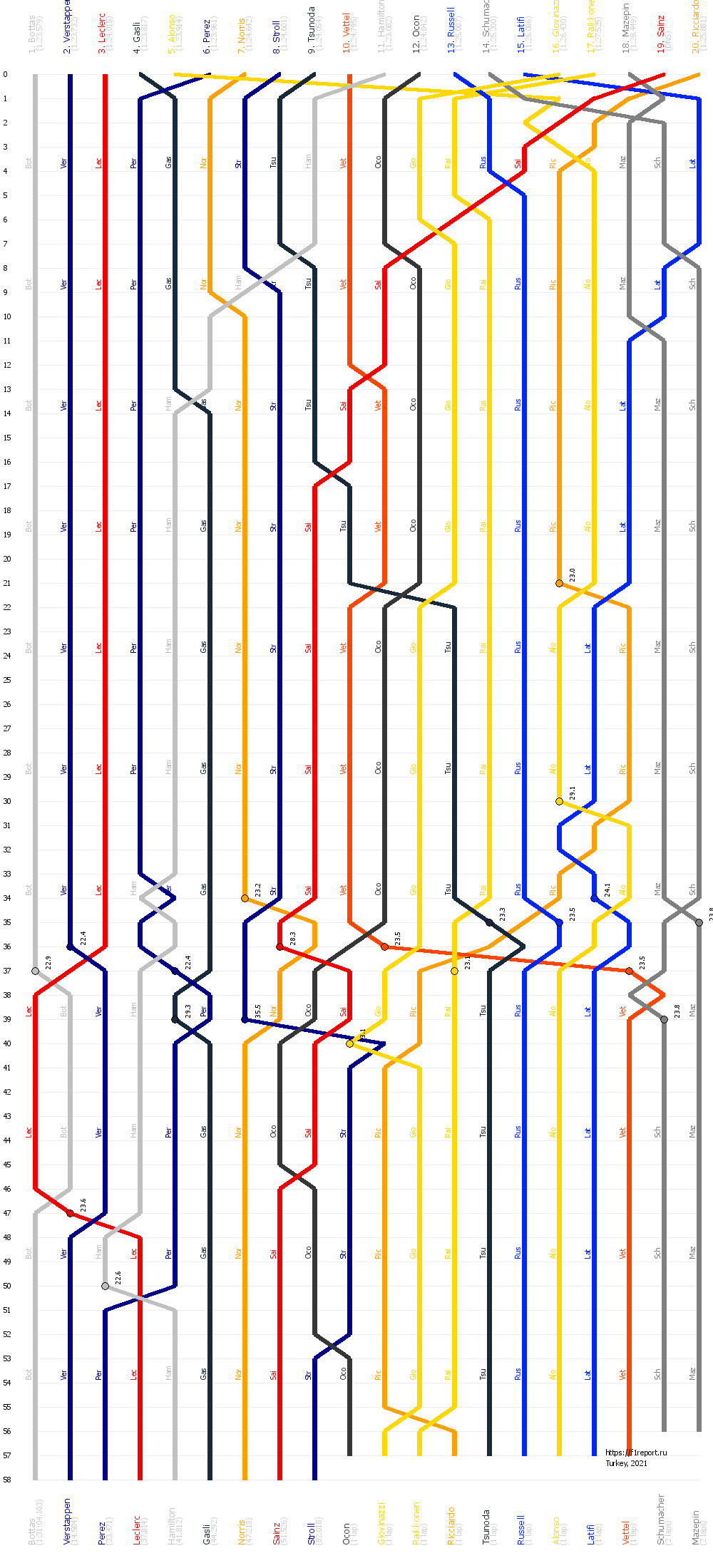 Диаграмма отображает смену позиций пилотов Формулы-1 на всем протяжении дистанции гран-при Турции 2021. Точками отмечены пит-стопы с указанием времени остановки.