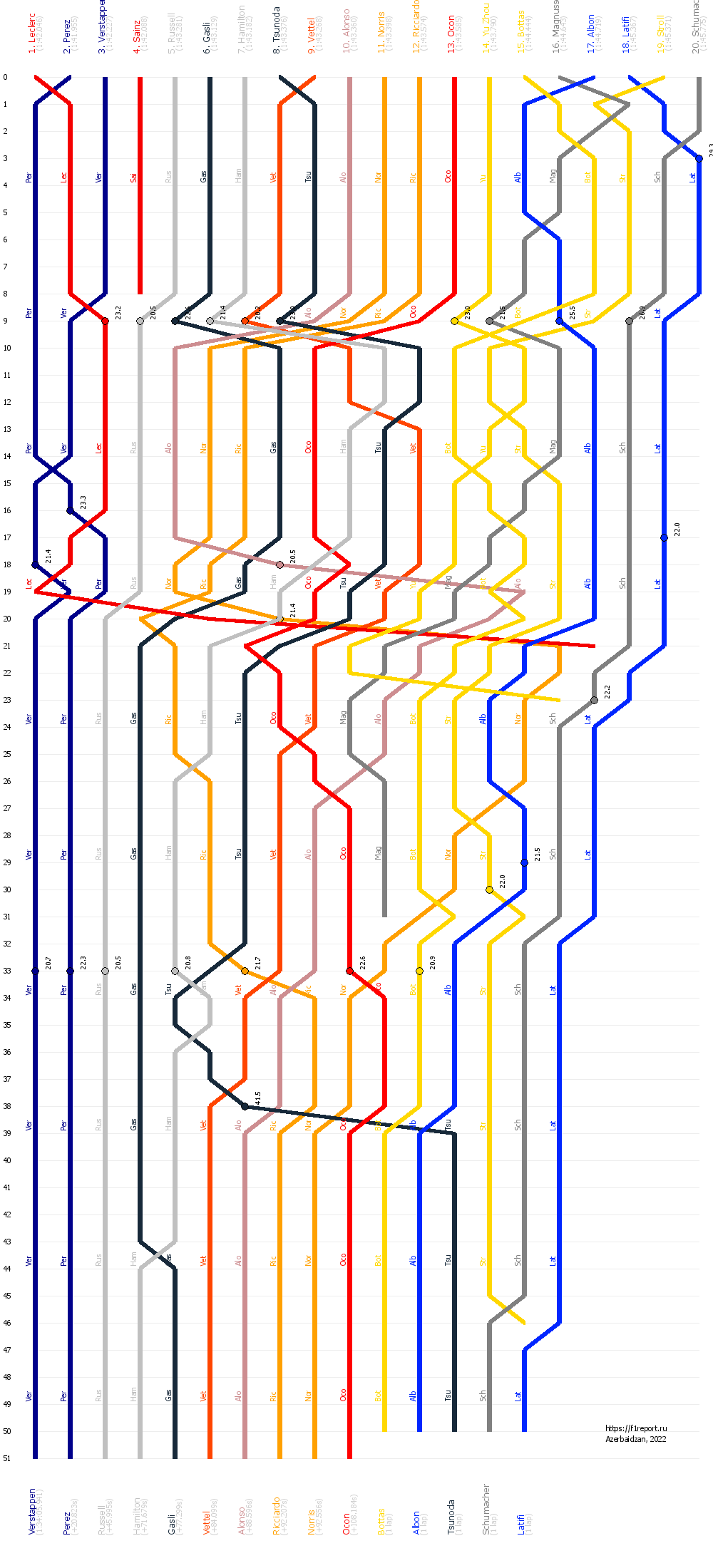 Диаграмма отображает смену позиций пилотов Формулы-1 на всем протяжении дистанции гран-при Азербайджана 2022. Точками отмечены пит-стопы с указанием времени остановки.