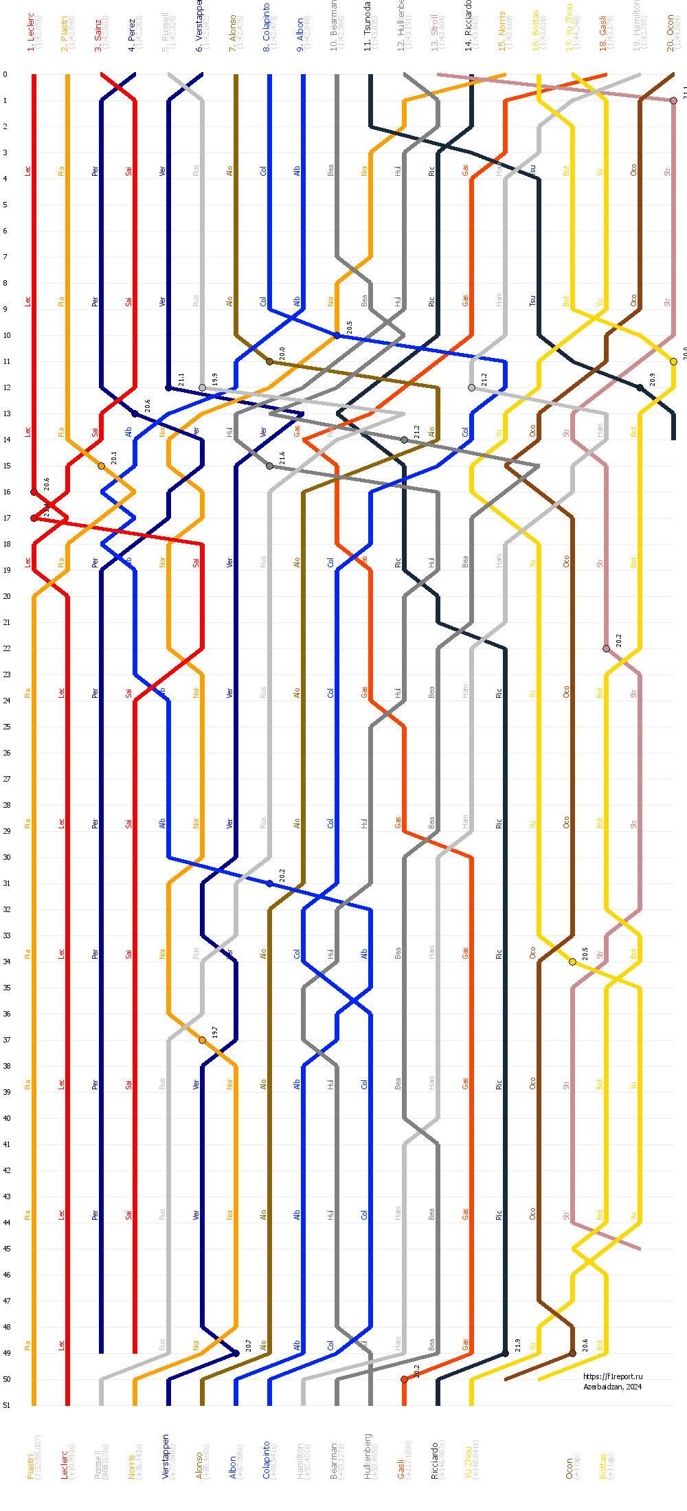 Диаграмма отображает смену позиций пилотов Формулы-1 на всем протяжении дистанции гран-при Азербайджана 2024. Точками отмечены пит-стопы с указанием времени остановки.