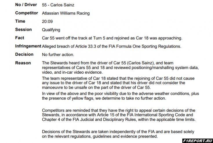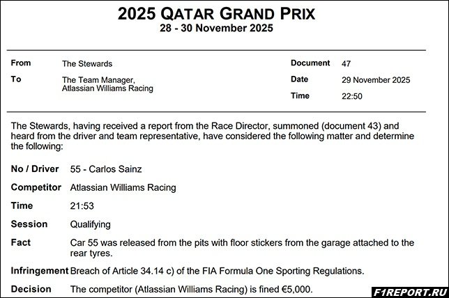 «Williams» оштрафована на 5000 евро за небезопасный выпуск машины на трассу Стюарды Гран При Катара вынесли решение по инциденту, произошедшему в субботней квалификации. Команда... 29 Ноя 2025 |
