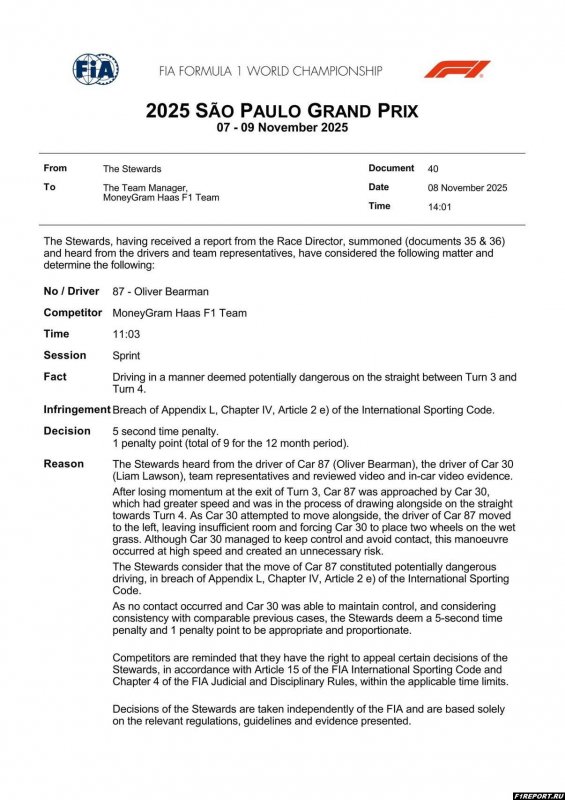 Стюарды вынесли наказание Оливеру Берману Во время спринтерской гонке Гран-при Бразилдии между гонщиком коллектива Haas Оливером Берманом и пилотом... 08 Ноя 2025 |