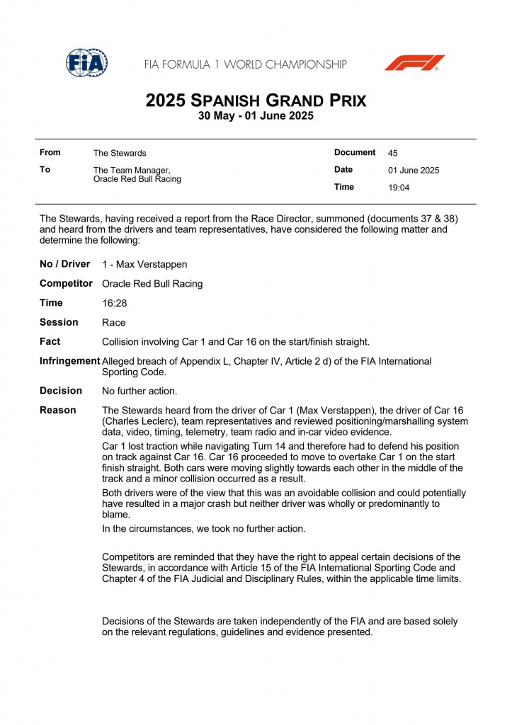 Борьба с Максом на стартовой прямой? Мы боролись, и я находился на слип-стриме позади. Макс хотел вынудить меня сместиться внутрь, но я не хотел этого делать, и пытался подтолкнуть его в противоположную сторону. Я хотел вынудить его сместиться левее, но произошел небольшой контакт, который, к счастью, обошелся без последствий”.