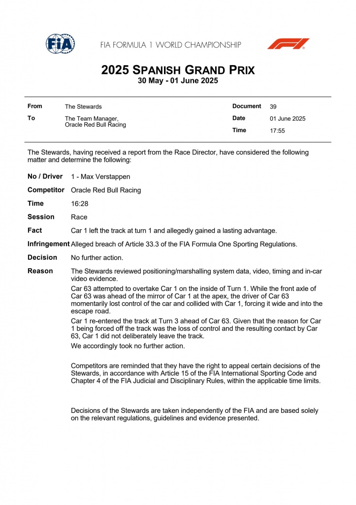 Стюарды Гран-при Испании опубликовали документ с результатами расследования инцидента между гонщиком “Red Bull” Максом Ферстаппеном и пилотом “Mercedes” Джорджем Расселом, который произошел на рестарте гонки Гран-при Испании в первом повороте. После контакта с Расселом Ферстаппен срезал поворот, но команда попросила его вернуть позицию Расселу по радио. Гонщик выполнил просьбу команды, но столкнулся с Расселом в пятом повороте, прежде чем пропустить его вперед.