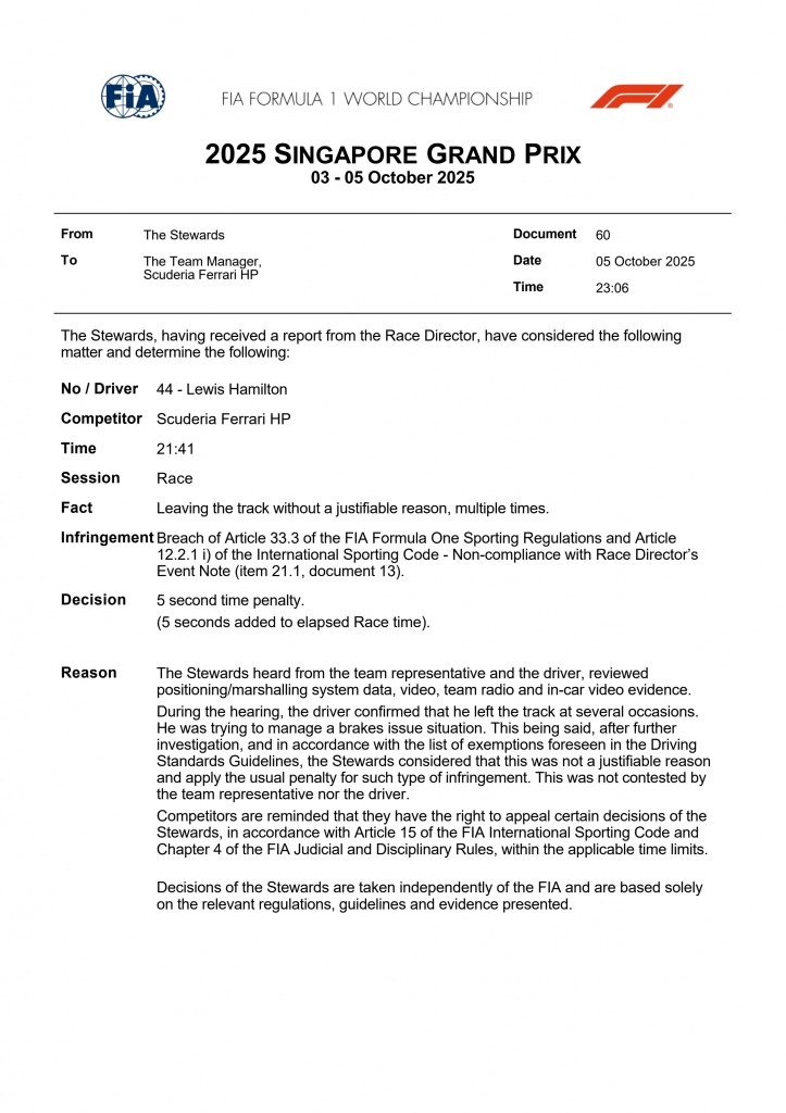Семикратный чемпион мира Льюис Хэмилтон из команды "Ferrari" был оштрафован по итогам Гран-при Сингаура.