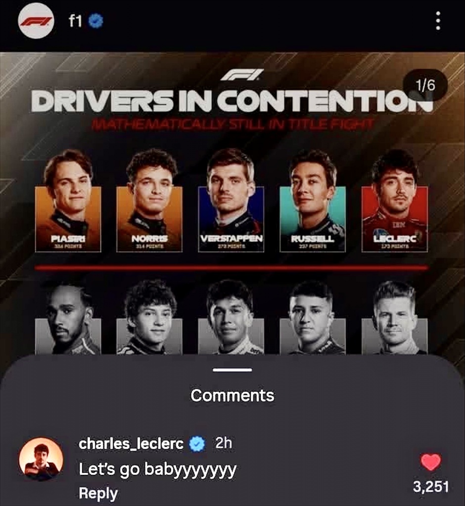 За 6 этапов до завершения сезона, шансы на титул сохраняют пять пилотов, кроме Оскара Пиастри, Ландо Норриса (отрыв от лидера 22 очка) и Макса Ферстаппена (отрыв от лидера 63 очка), чисто математически, шансы на титул так же имеют Джордж Рассел (отрыв от лидера 99 очков) и Шарль Леклер (отрыв от лидера 163 очка), так как в розыгрыше, учитывая три спринтерских этапа в Остине, Бразилии и Абу-Даби остаётся суммарно 174 очка.