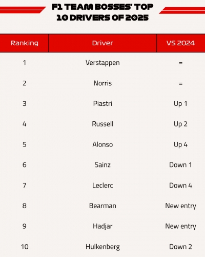 Лучшим гонщиком по версии боссов коллективов пятый раз подряд стал Макс Ферстаппен из Red Bull. Второе место досталось гонщику McLaren Ландо Норрису, третьим стал его напарник Оскар Пиастри.