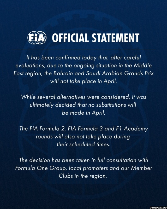 В официальном сообщении FIA говорится: "Сегодня было подтверждено, что после тщательной оценки, в связи с текущей ситуацией в ближневосточном регионе, Гран-при Бахрейна и Саудовской Аравии не состоятся в апреле.