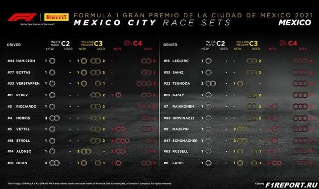 Комплекты шин, которые остались у пилотов перед стартом гонки в МексикеПеред стартом гонки в Мексике представители Pirelli опубликовали информацию об оставшихся комплектах шин у пилотов Формулы 1. | |