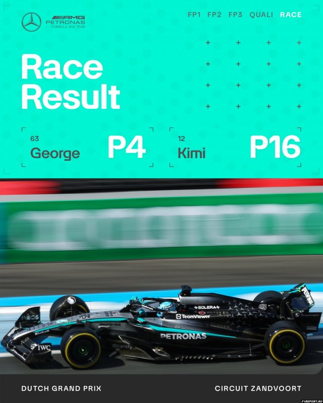 Расселл четвёртый, Антонелли шестнадцатый2Пилот команды Mercedes Джордж Расселл финишировал четвёртым на Гран При Нидерландов. Его напарник Кими Антонелли после штрафа опустился на шестнадцатую позицию. | |