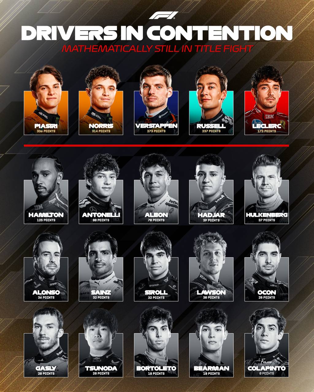 Пять пилотов ещё сохраняют математические шансы на титул2Судьба Кубка конструкторов решилась на прошлом этапе, а вот судьба чемпионского титула пока под вопросом. За 6 этапов до завершения сезона, шансы на титул сохраняют пять пилотов, кроме Оскара Пиас... | |