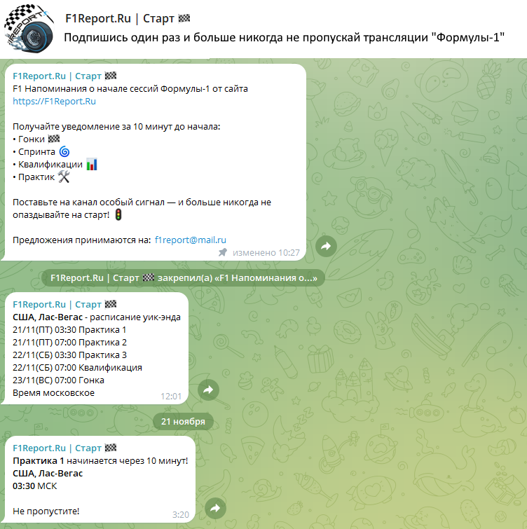 Telegram уведомления о начале сессий Формулы-1 - новая опция от F1Report.Ru5Чтобы вы больше никогда не пропускали трансляции Формулы-1, сайт F1Report.ru создал специальный Telegram-канал... | |